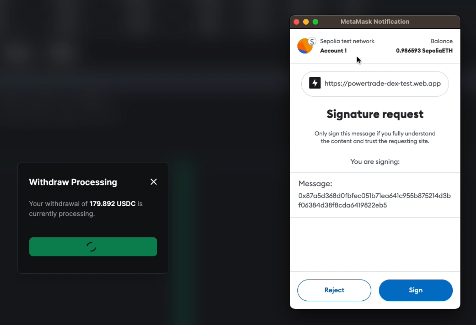 3. You will be then prompted in your wallet with a **Signature Request.** Click “Sign” and the withdrawal will begin processing. **There are no fees for withdrawals for Polaris.**