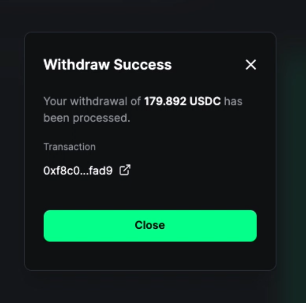 3. Once the withdrawal has been processed, you’ll see a confirmation of the withdrawal and a link to the transaction on the Block Explorer.